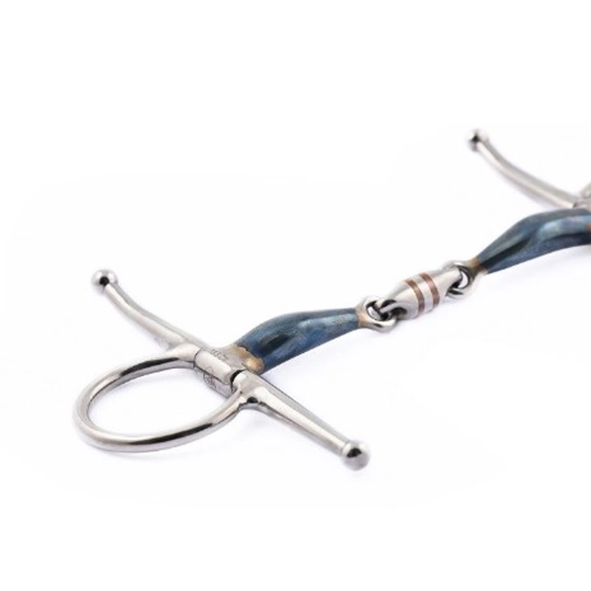 The Blue Steel alloy used in this Jump’In range is made of 54% carbon and 46% manganese. Blue steel bit oxidizes with air and humidity creating a thin layer of rust which has a sweet taste. It will stimulate the production of saliva and naturally allow the horse to relax. The horse will be more comfortable and will take the bit more. The bit color will turn into a greyish brown due to this oxidation process