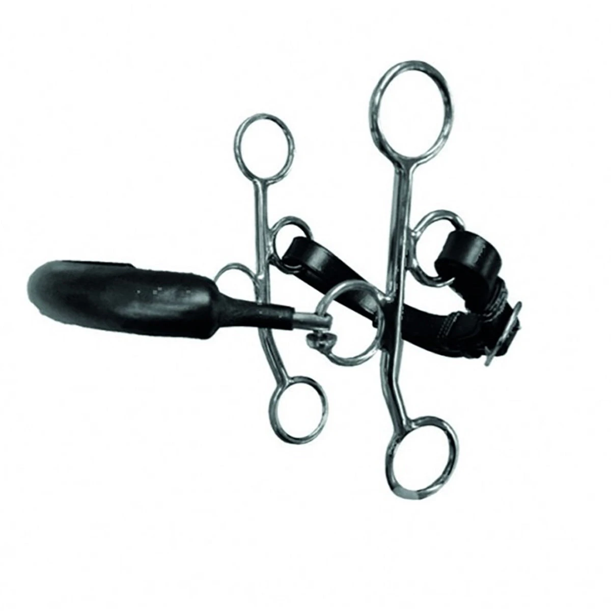 Hackamore with a rubber coated noseband, stainless steel cheeks and leather curb chain. The Hackamore has a lever action on the bridge of the nose and the mandibles only. It will not have any action on the inside of the mouth. It it great for horses that don’t tolerate bit contact in their mouth, for those that fight the rider’s hand or for those that can’t be ridden with a mouthpiece.