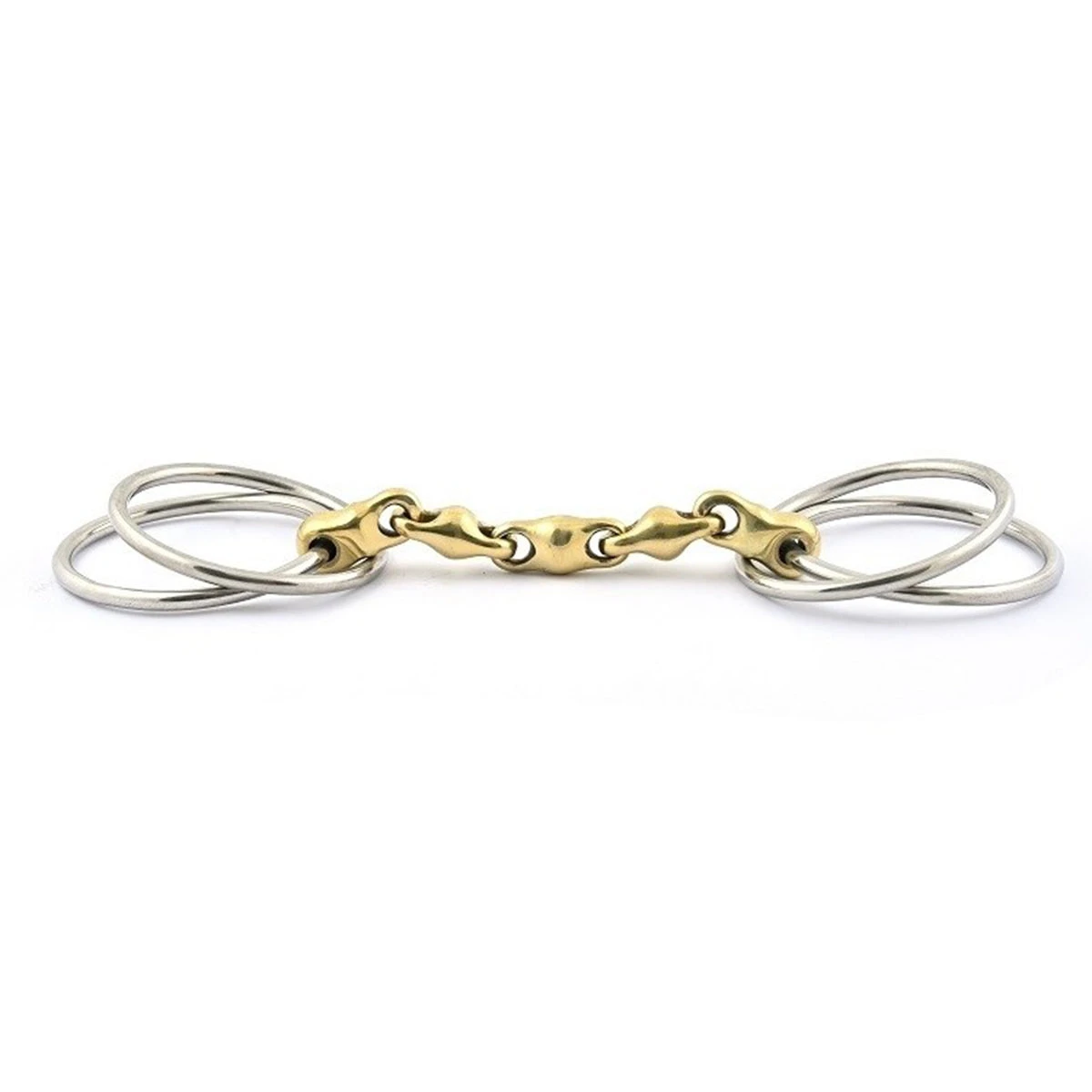 Featuring 70mm rings, 17 mm mouthpiece, and composed of a German Silver, a relaxing and solid alloy. This bit is unique in the fact that breaks up the pressure points on the horse. Comprised with 4 rings, the “loose” inner rings are attached the the cheekpieces and the outer rings are connected to the reins. The bit squeezes the cheeks as opposed to pulling on the bars of the mouth.Â
