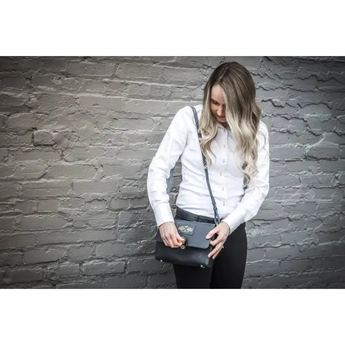 Shoulder bag in dark blue-black raw leather. Oakbark & Chrome’s shoulder bags are loved by both equestrians and non-equestrians alike with their thoughtful features: tactile top grain leather (looks better the more it is worn!), the front stirrup clasp (ensuring nothing falls out), the stabilizing feet (keep the bottom clean), and it’s classic herringbone lining.