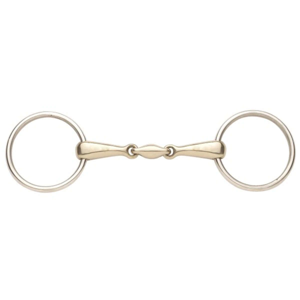 The Ovation Elite Bits feature a shorter rotated link, which allows it to rest entirely on the tongue when rein pressure is applied. This special positioning allows for more precise communication through the reins. The loose ring snaffle encourages a relaxed jaw and mobile tongue. This bit is a classic dressage bit. Â