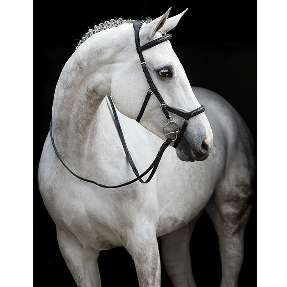 Softer, more flexible leather in a slightly wider width ensures enhanced horse comfort. Intended for use as a bitted bridle, it has hand-rubbed edges, stainless steel hardware and includes matching rubber reins.