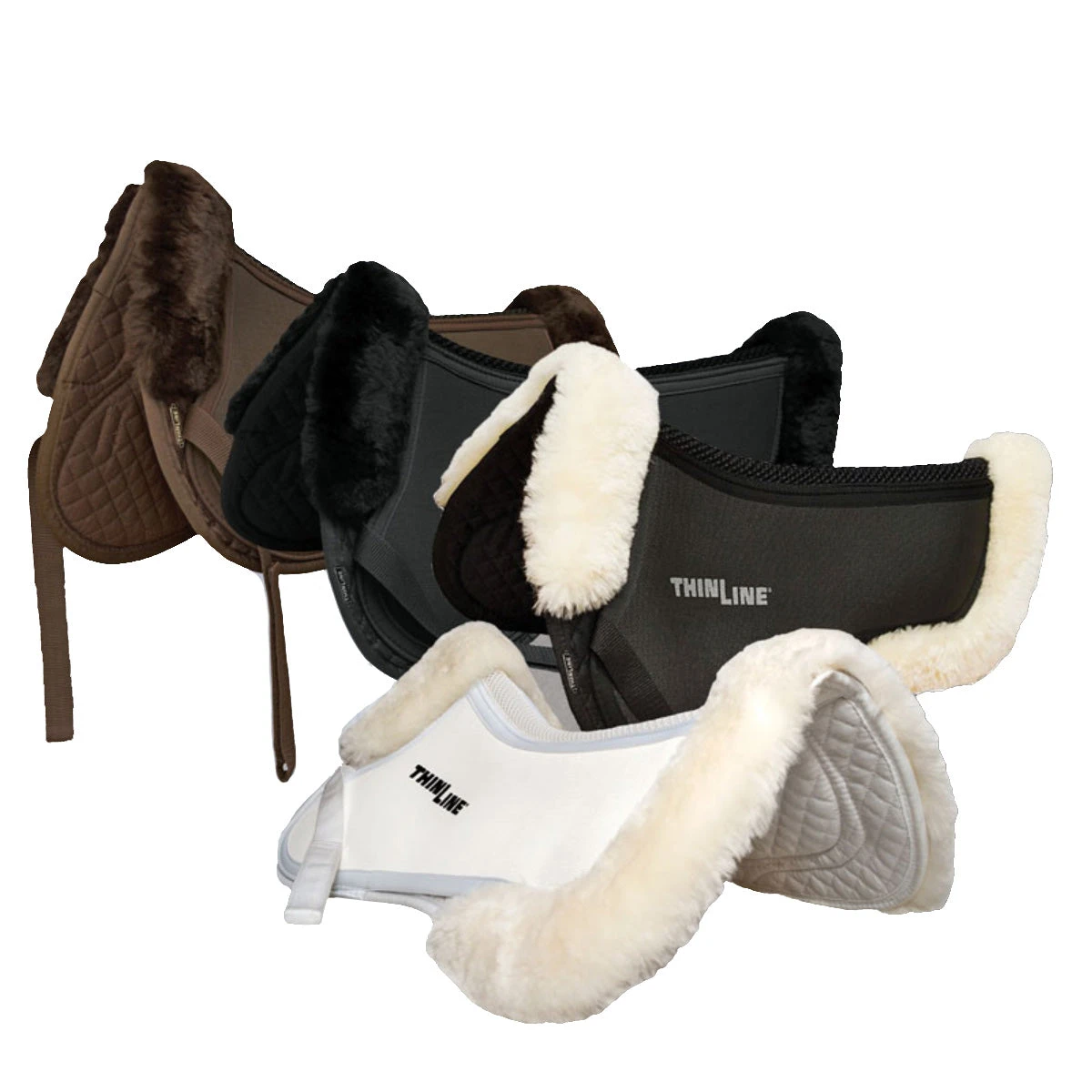 ThinLine Trifecta Half Pad with Sheepskin Rolls Reduce Rider Movement, Protect Horses’ Backs, Improve Saddle Fit. The cotton base design with ThinLine on top creates a nice wither profile and the spine-free channel allows ThinLine to lay on either side of the spine so that it is always in the right place.  It is the dual benefit of extraordinary shock absorption and rider motion reduction that sets ThinLine apart from other saddle pads.  Now with a longer drop. The ThinLine panel has been enlarged to protect below the stirrup bar. The larger pocket allows you to shim more behind the point of the shoulder.  Trifecta Lays flat to easily combine with other base pads.